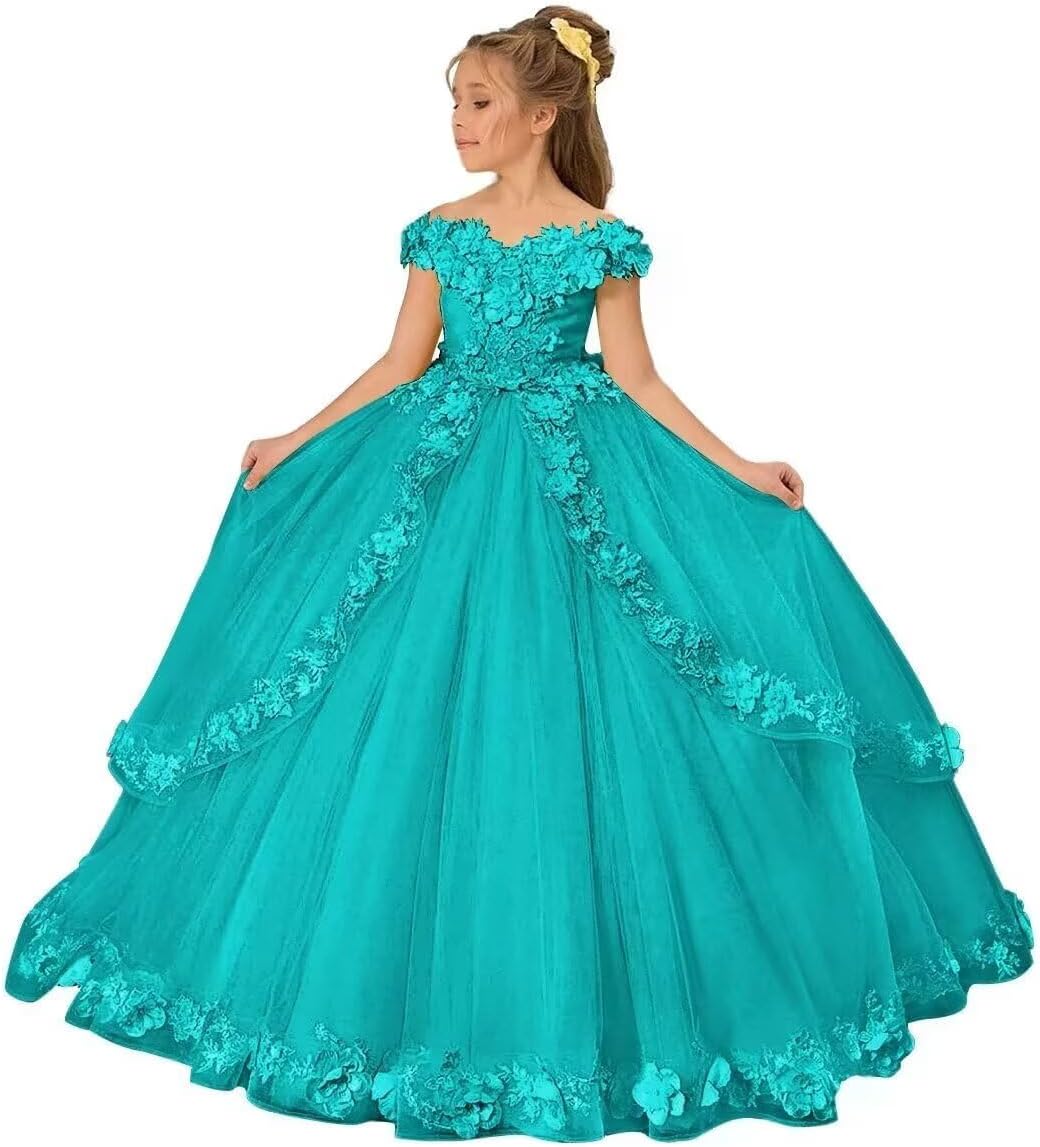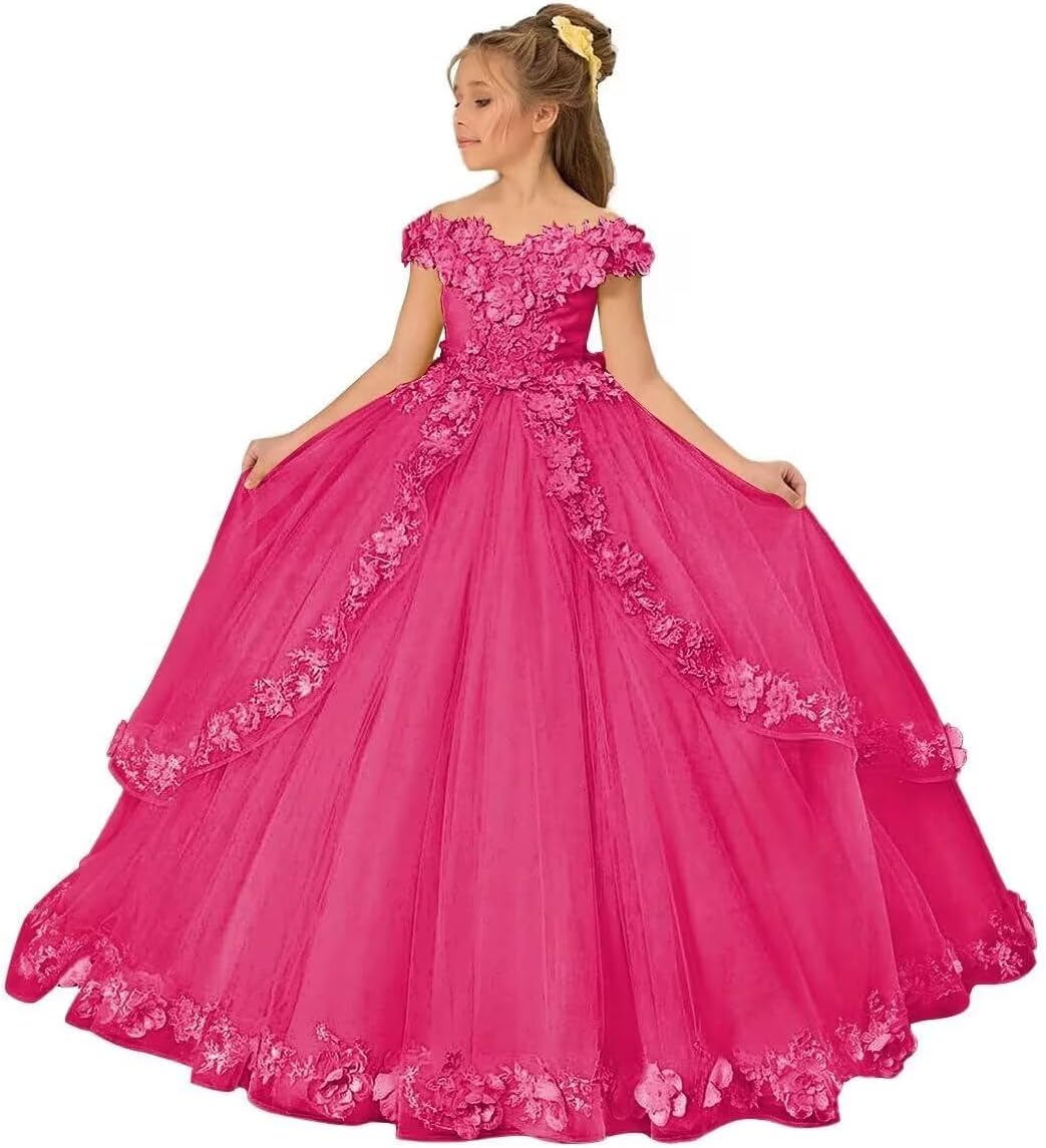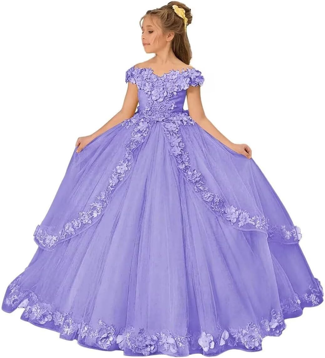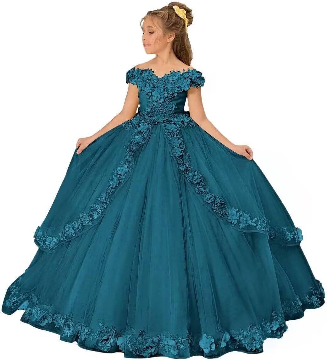 Features:Tulle Flower Girl Dress,3D Floral Pageant Dresses for Girls,Long Girls Pageant Dresses,Off The Shoulder Flower Girl Dress Ball Gown