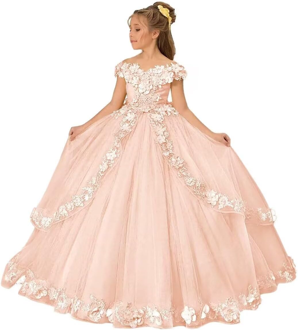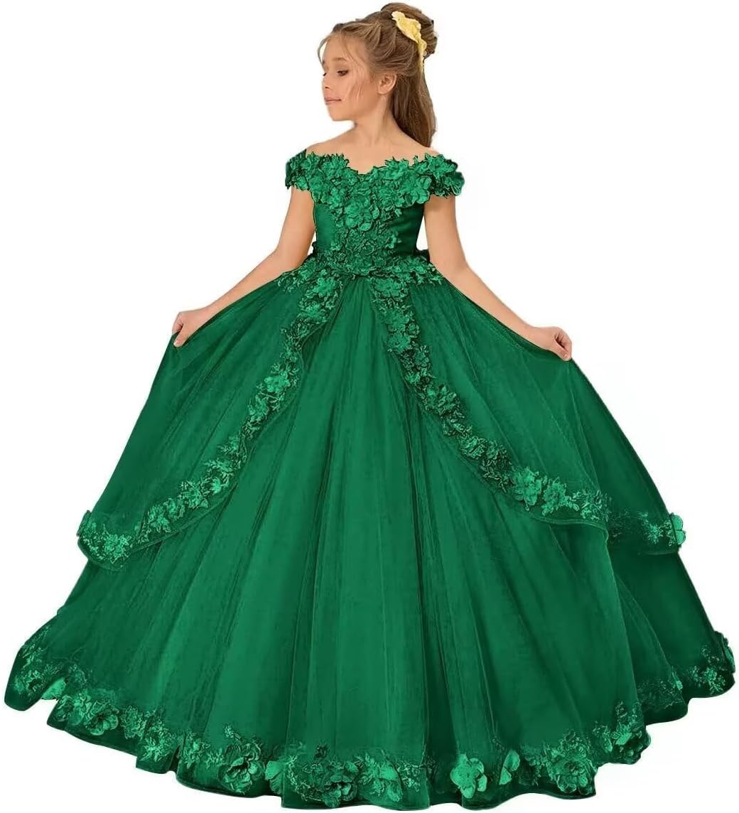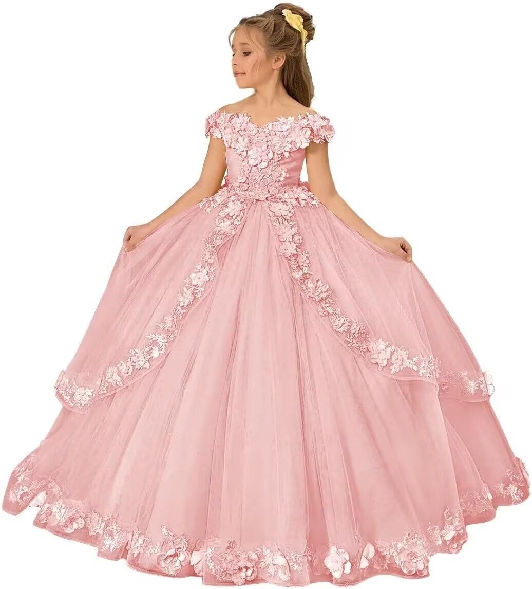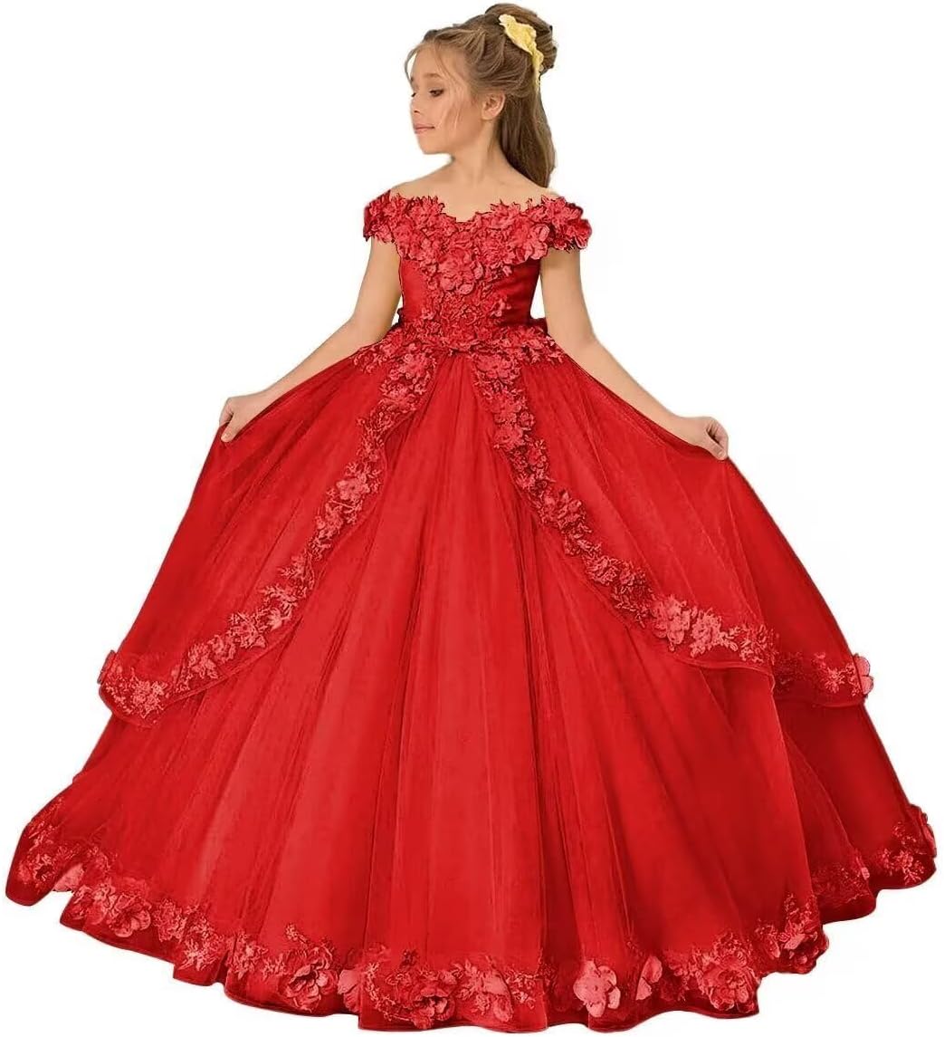 Features:Tulle Flower Girl Dress,3D Floral Pageant Dresses for Girls,Long Girls Pageant Dresses,Off The Shoulder Flower Girl Dress Ball Gown