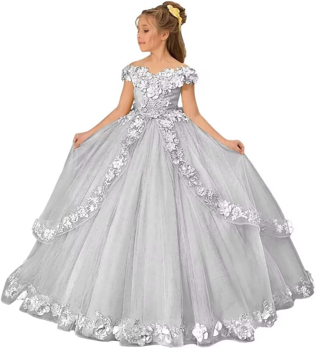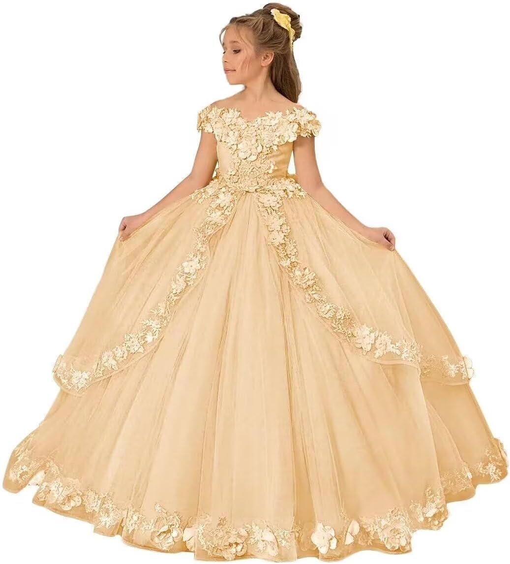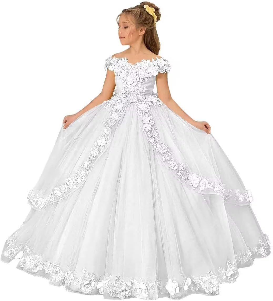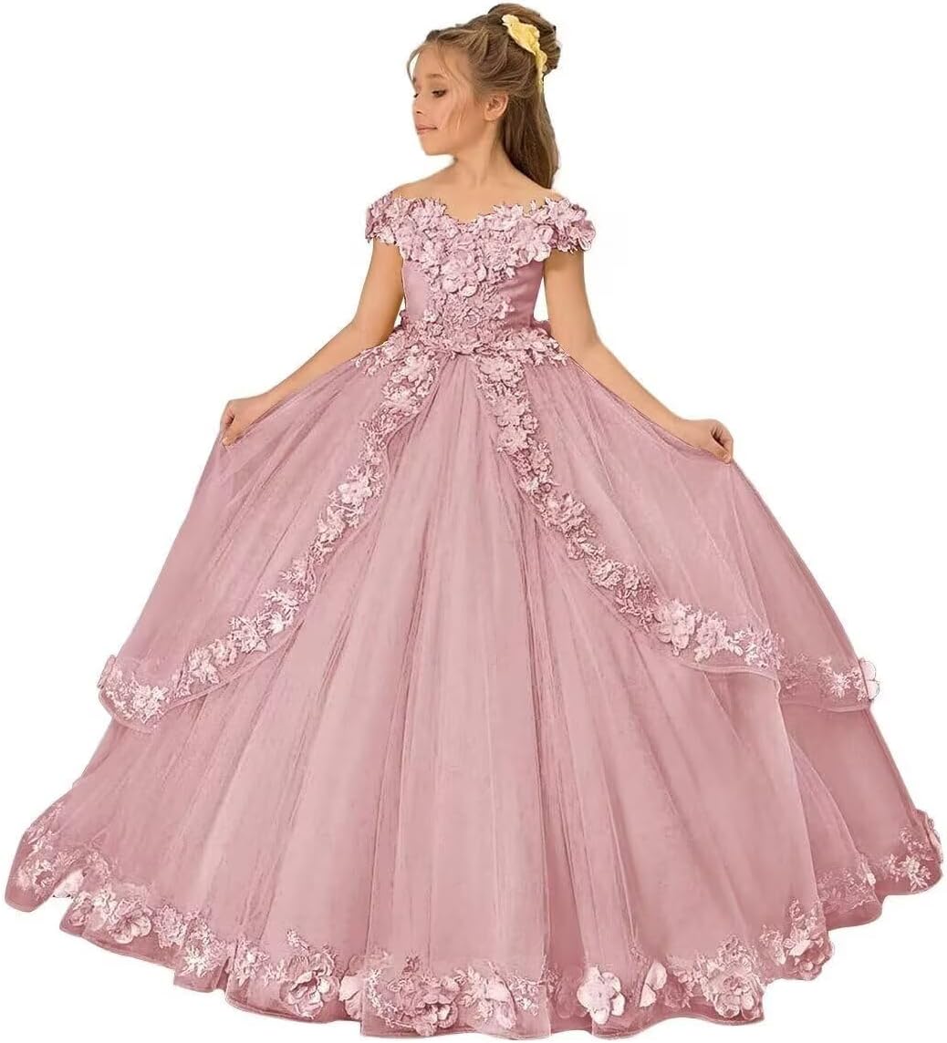 Features:Tulle Flower Girl Dress,3D Floral Pageant Dresses for Girls,Long Girls Pageant Dresses,Off The Shoulder Flower Girl Dress Ball Gown